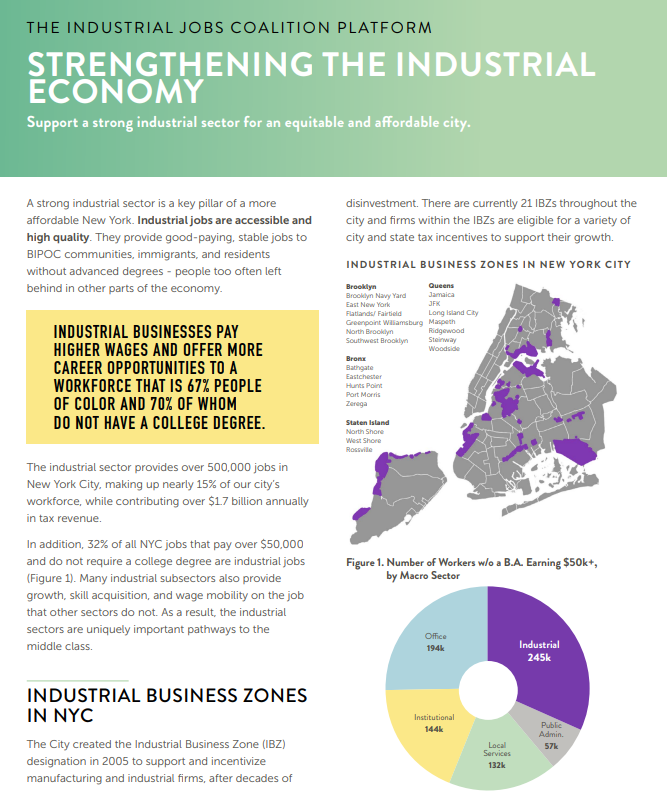 The Industrial Jobs Coalition is a citywide alliance of community groups, policy advocates, and service providers fighting to protect and preserve manufacturing as a sector in New York.
