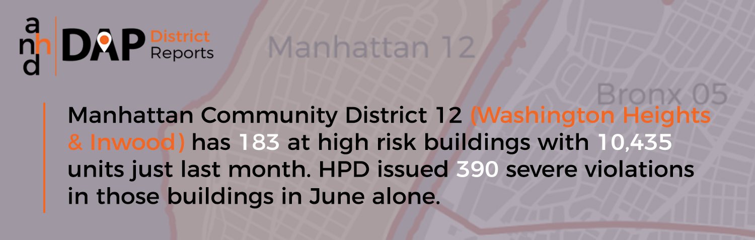 So what’s ailing Inwood? In a few words: speculation and displacement. Community District 12 has the highest concentration of rent stabilized housing in New York City, making up some two thirds of the neighborhood’s total housing stock. With a median household income of around $46,000 and a third of households making below 30% AMI (about $28,000 a year for a family of three), this is a neighborhood that can ill afford to lose this stabilized housing stock. Yet Inwood is losing stabilized apartments at an alarming rate, the third highest rate of any Community District in New York. ANHD’s Displacement Alert Project District Reports – a monthly update of harassment and displacement risk in stabilized buildings – shows that Manhattan Community District 12 has the highest number of buildings at high risk of displacement in the entire city: 183 at high risk buildings containing 10,435 units just last month. HPD issued 390 severe violations in those buildings in June alone.