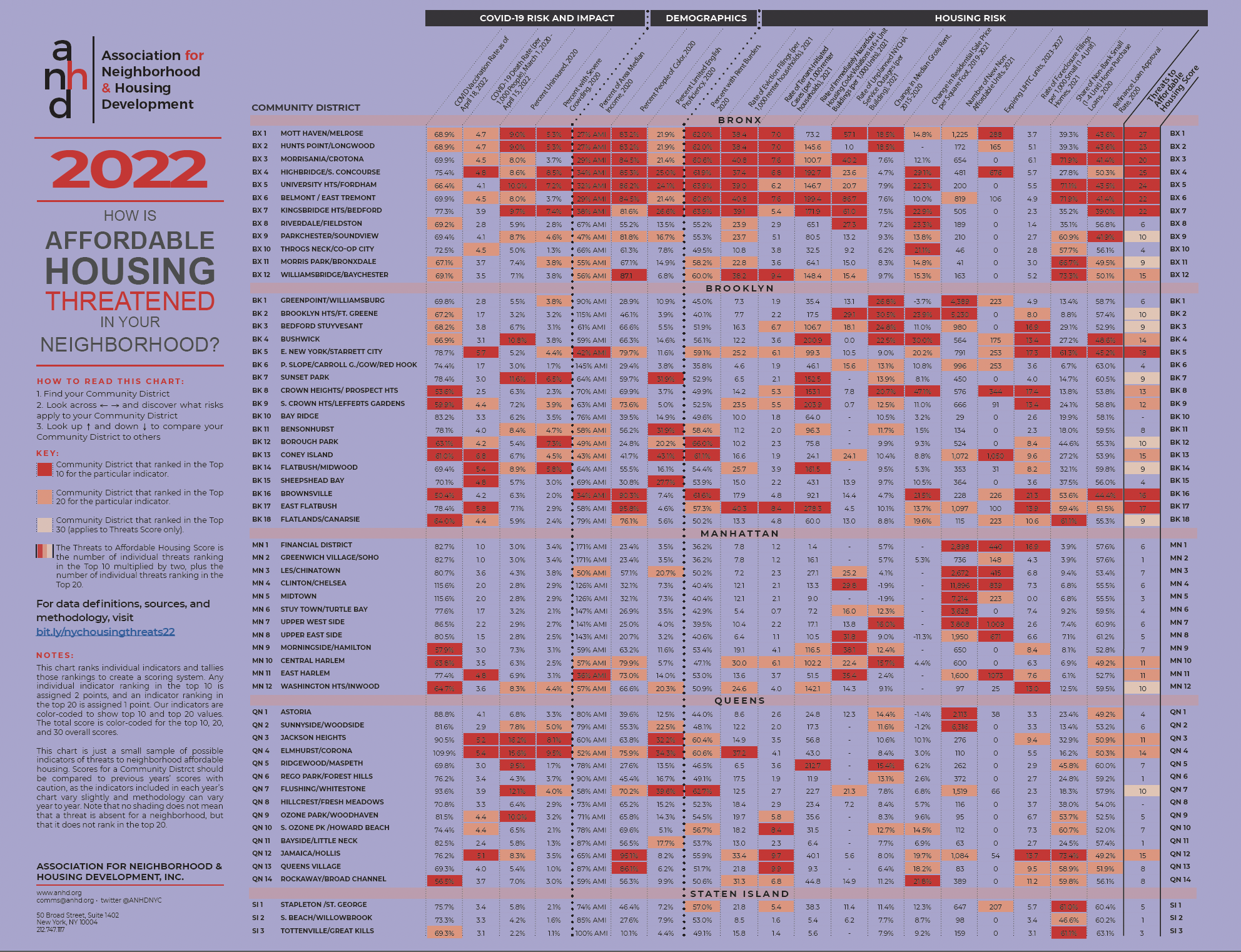 ANHD’s 2022 Housing Risk Chart highlights and ranks 19 indicators of risk to affordable housing in each of New York City’s 59 community districts. Our annual analysis helps community-based groups, government officials, and other stakeholders determine where to direct resources to stabilize communities. The 2022 edition of ANHD’s Housing Risk Chart demonstrates the diverse and multifaceted threats to housing stability for communities of color, low-income households, immigrants, and other marginalized groups.